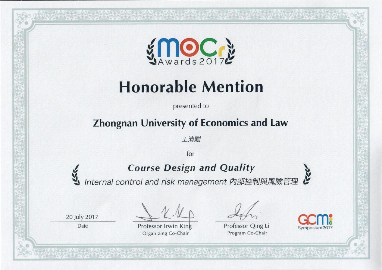 2017年7月,该课程入围在香港中文大学举办的首届大中华地区优秀MOOC选拔赛总决赛,并获最佳课程设计提名奖;2017年12月,同时获评湖北省及国家级精品在线开放课程。