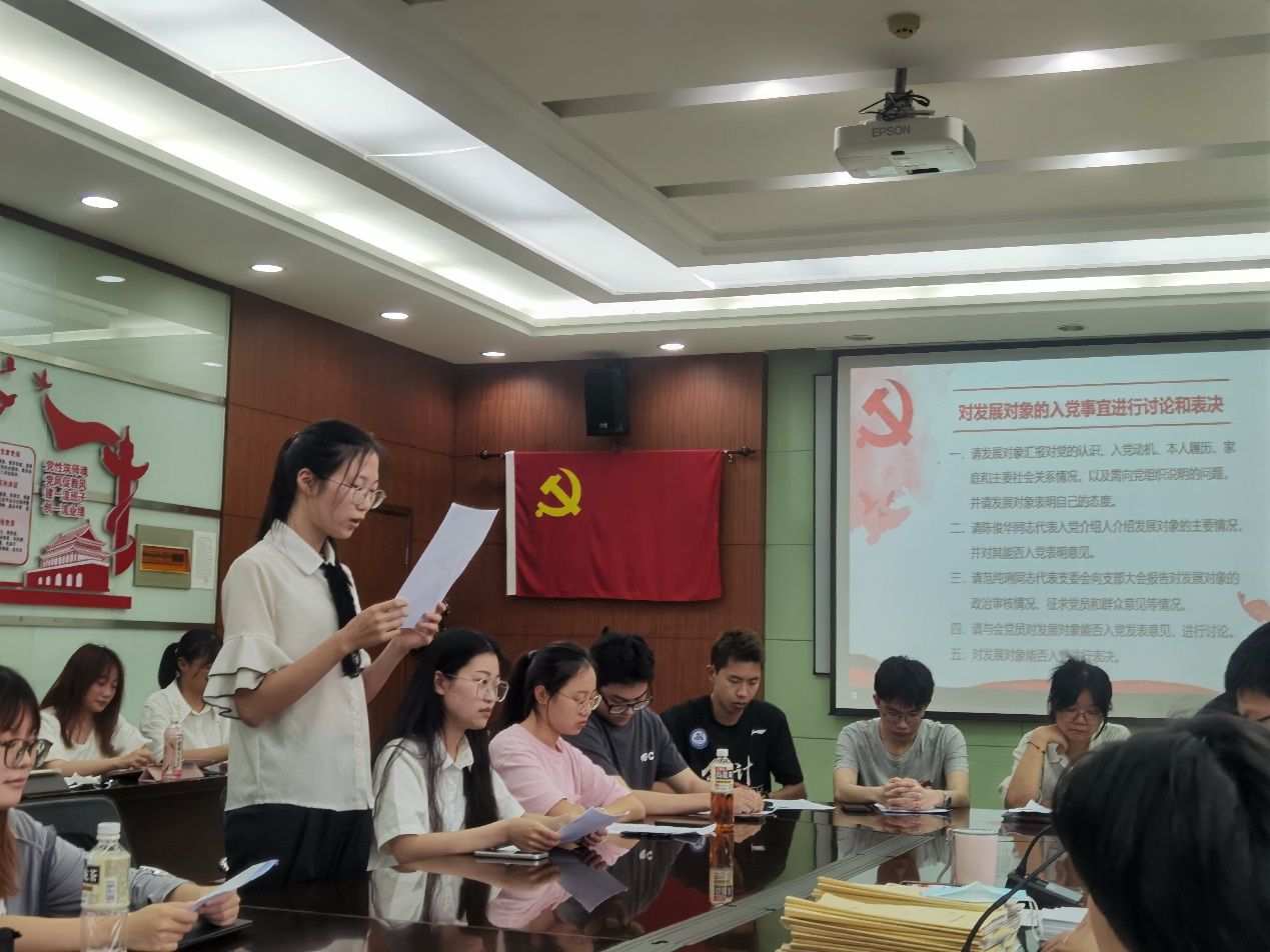 会议伊始,由发展对象逐一汇报自身对党的认识、入党动机、本人履历、家庭和主要社会关系情况,并深刻剖析自身存在的不足,以及其他需要向党组织说明的问题。陈俊华同志代表入党介绍人简要介绍了发展对象的主要情况并对其能否入党表明意见。范纯琍同志代表支委会向大会报告对发展对象的政治审核情况、征求党员和群众意见等情况。大会以不记名投票的方式进行表决,关于接收丁诗怡等30名发展对象为中共预备党员的决议均顺利通过。